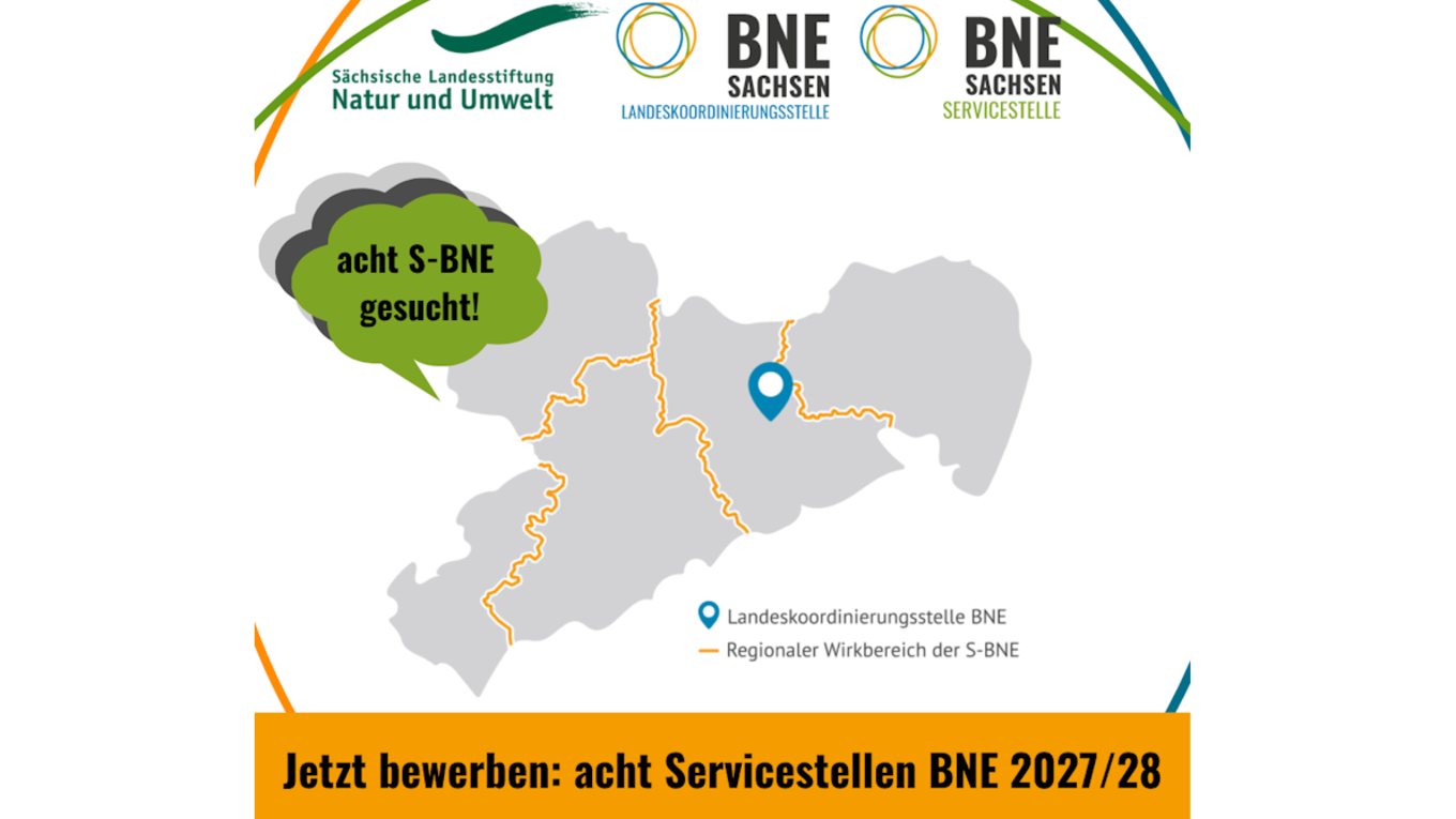 Die Landeskoordinierungsstelle BNE (K-BNE) bei der Sächsischen Landesstiftung Natur und Umwelt (LaNU) hat ein systematisches Verfahren zur Neubestimmung des Servicestellennetzwerkes BNE gestartet, das aus insgesamt acht Servicestellen BNE (S-BNE) bestehen und an die seit 2023 laufende Arbeit anknüpfen soll. Einrichtungen, Institutionen und Organisationen, die an einer Kooperation mit der LaNU in den Jahren 2027 und 2028 interessiert sind, um eigenverantwortlich, im Rahmen beschriebener Aufgaben, den BNE-Gedanken aktiv zu befördern, sind hiermit aufgerufen, sich für eine Mitwirkung im Netzwerk zu bewerben.